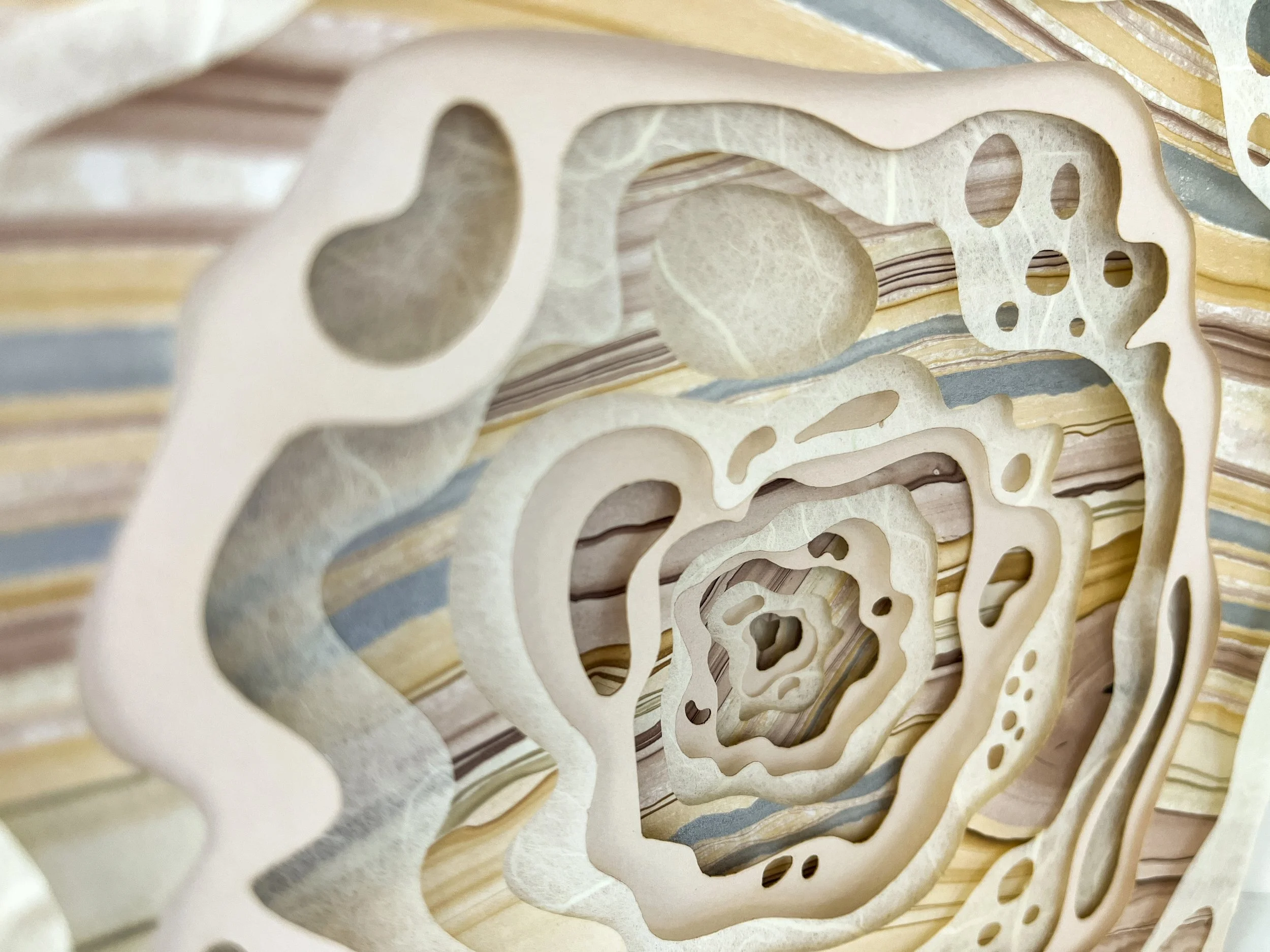 This laser-cut paper sculpture focuses on blending technology with traditional art forms to create a dichotomy of art from the future and the past. This piece is 15 layers of handmade paper with thin balsa wood inserts between each layer to create dimension.
